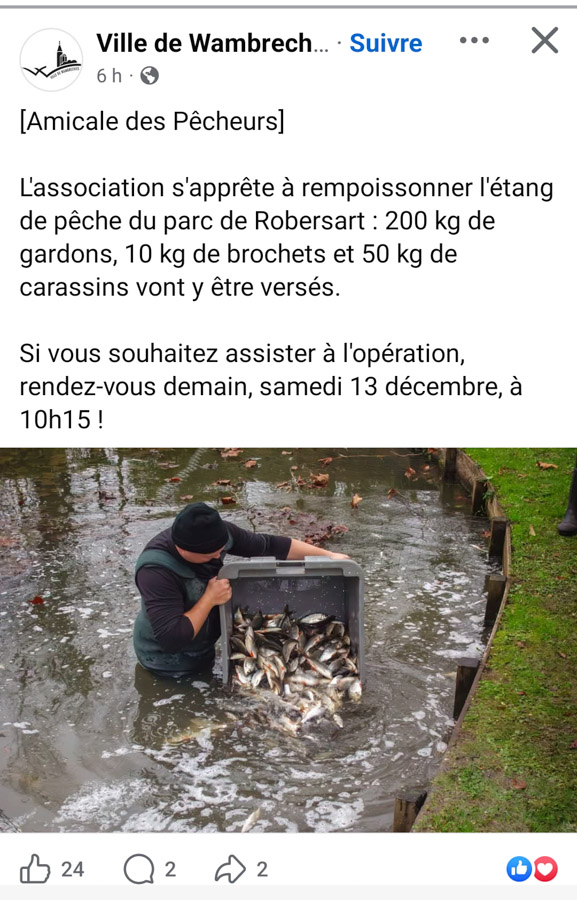 Le rempoissonnement est prévu pour le samedi 13 décembre 2025. Rendez-vous autour de l’étang à 10h15.